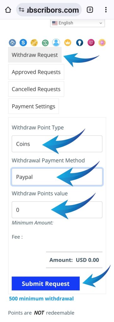 Go to Withdraw Request. Under the tab “Withdraw Point Type” select “Coins.” NOTE: If the coins option is NOT selected your withdrawal request will be denied and the transaction is canceled, You will be able to resubmit your request afterwards. Next select Paypal as the withdrawl payment method. Next select the amount that you want to withdraw. Be sure that all or the information provided is correct. Lastly, select “Submit Request” NOTE: All Payments request are reviewed and requests that are approved will be paid out immediately. Requests that are not approve will be canceled. If a withdrawl request is canceled it could be for a number of reasons. Most commonly incorrect information details were entered, or required fields were not properly filled in. Only after a withdrawl request is denied and the transaction is canceled can another withdrawl request be submitted.NOTE: When submitting the amount that you want to withdraw exclude the fee of 25% EXAMPLE: If you’re withdrawing 10.00 you will need to have 250 coins remaining in your account to pay the transaction fee of 25%.